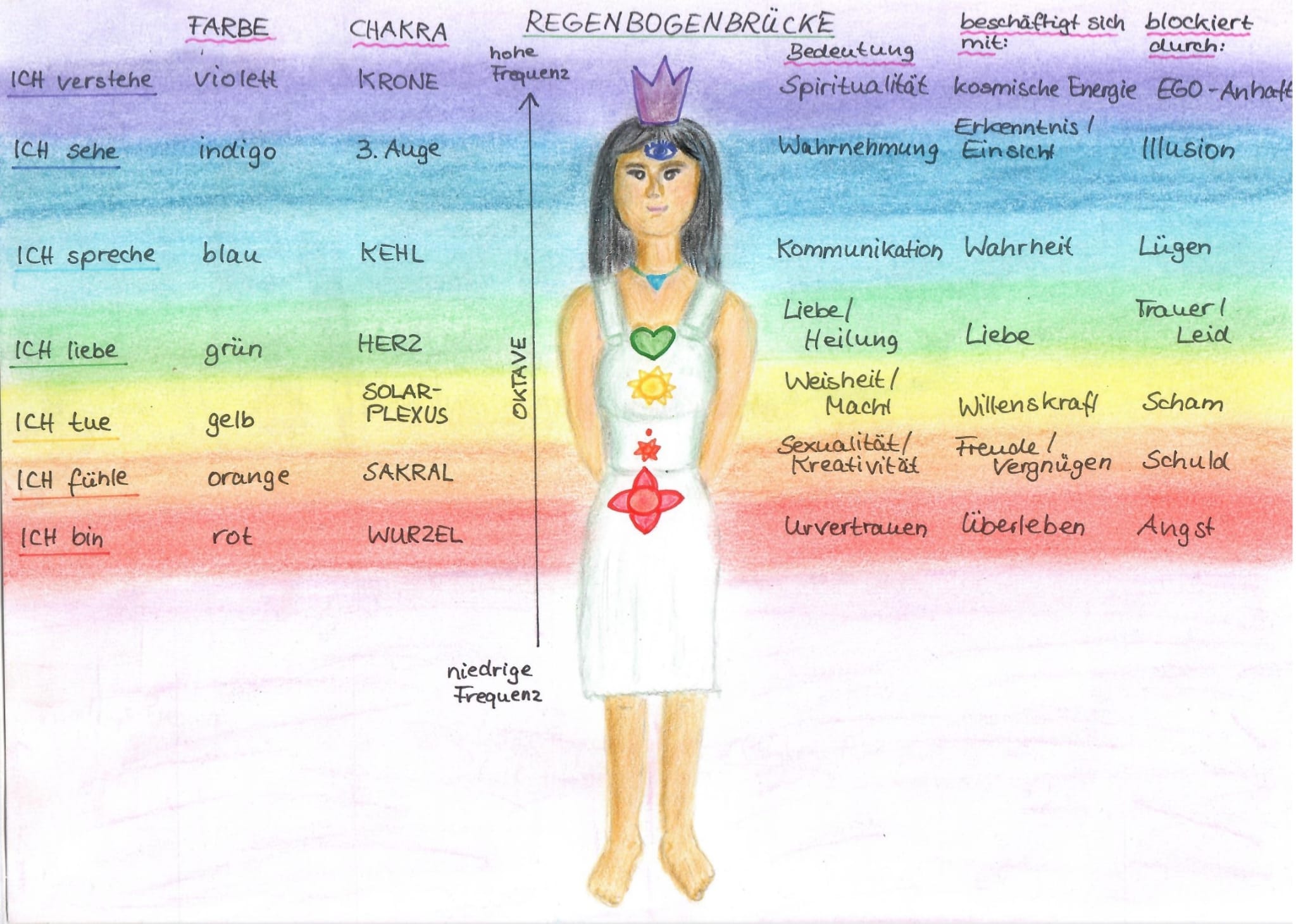 Wusstest du, dass wir 7 Energiewirbel in unserem Körper haben, die genau die 7 Regenbogenfarben haben? Hellsichtige Menschen können sie sehen; es sind runde Energiewirbel, die wie Lotusblüten aussehen. Auch wenn wir sie nicht sehen können, sie sind da - und sie sollten sich drehen. Bleiben ein oder mehrere stehen, wird man irgendwann krank. Die alten Inder wussten das alles und haben glücklicherweise ihr Wissen weitergegeben. Die Energiewirbel heißen CHAKRAS und auf dem Bild kannst du sehen, wo sie sind und wie sie heißen.