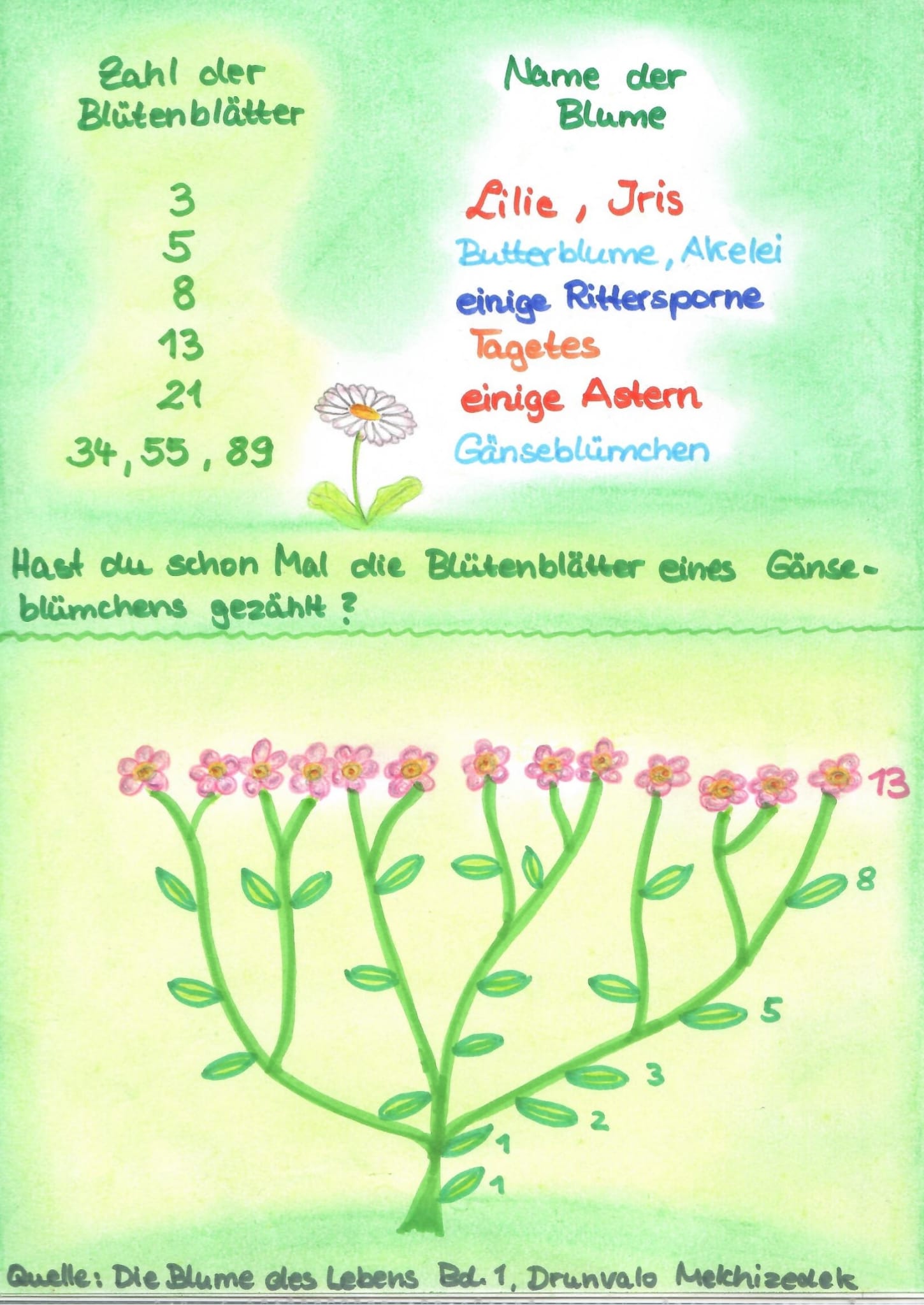 Es lebte einmal, vor vielen hunderten Jahren, ein Mönch, der 2 Dinge sehr sehr liebte. Das waren zum einen die Natur; er liebte es, durch die Wälder zu streifen; und zum anderen faszinierten ihn Zahlen. Und so begann er auf seinen zahlreichen Spaziergängen, nicht nur zu schauen, sondern auch zu zählen. Er zählte die Blätter der jungen Pflanzen, er zählte die Samen und er zählte die Blütenblätter der Blumen. Dabei fiel ihm auf, dass er immer wieder auf ganz bestimmte Zahlen stieß. So gibt es Blumen, die nur 3 Blütenblätter haben (z.B Lilien), andere haben 5 (wie z.B. Butterblumen), wieder andere haben 8, Ringelblumen 13, manche Arten 21 und Gänseblümchen haben fast immer 34, 55 oder 89 Blütenblätter.